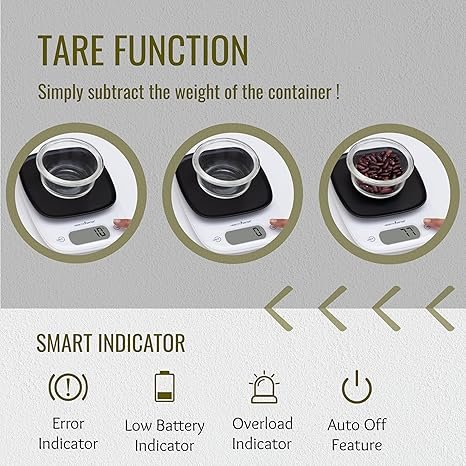 EASY TARE FUNCTION: Calculate net weight of ingredients by subtracting empty bowl or container weight. Press TARE button to reset scale to zero & weigh while adding ingredients to same container